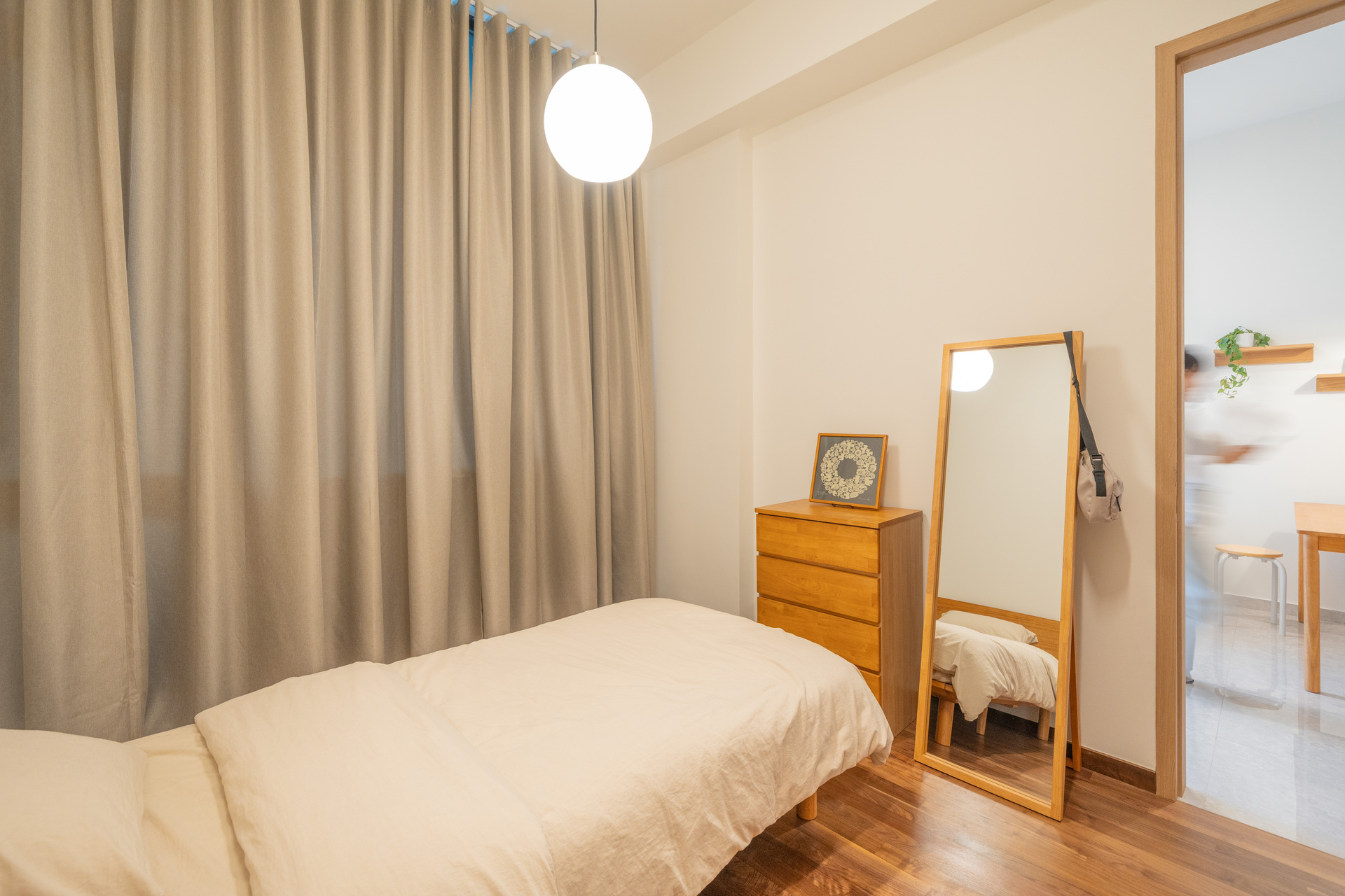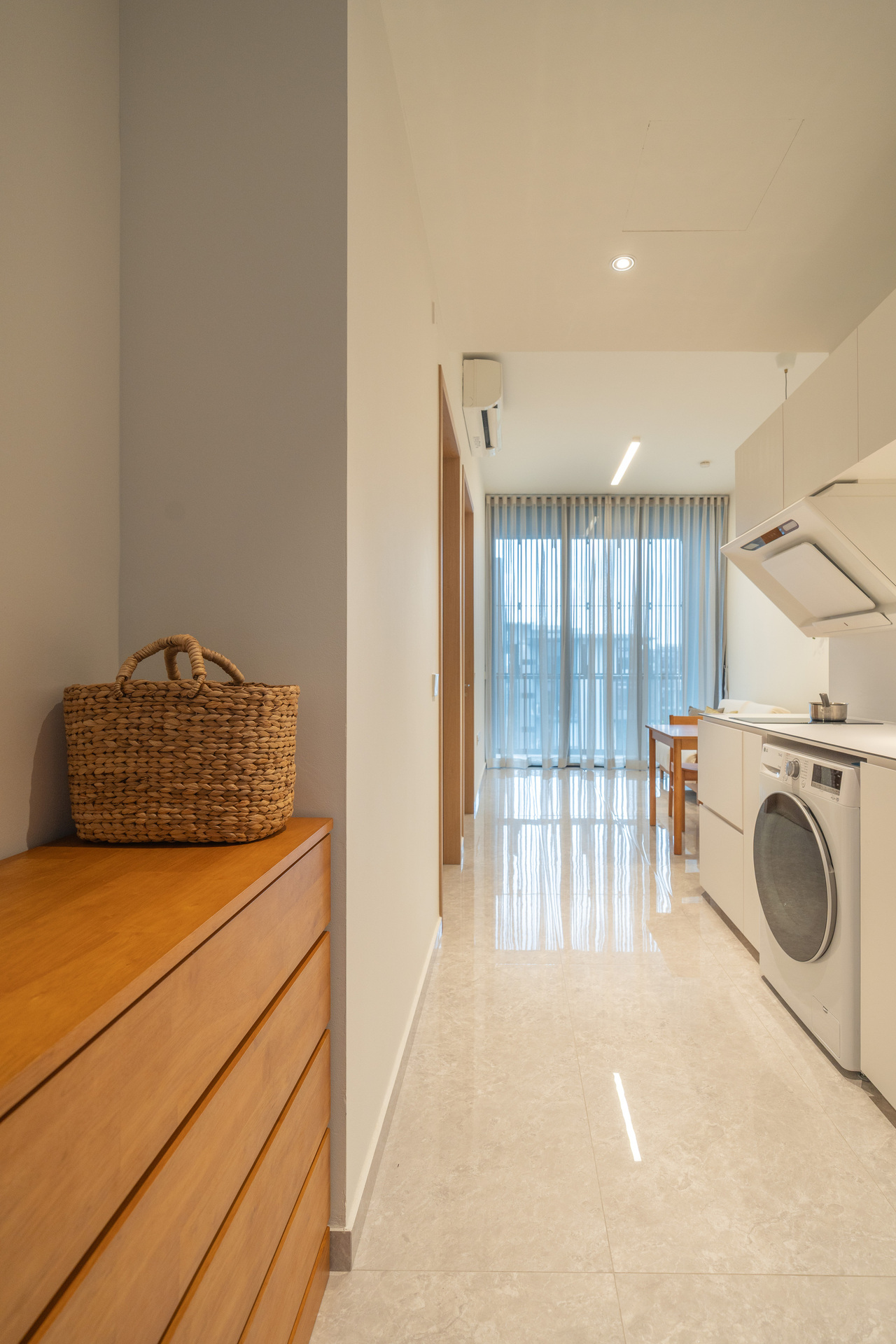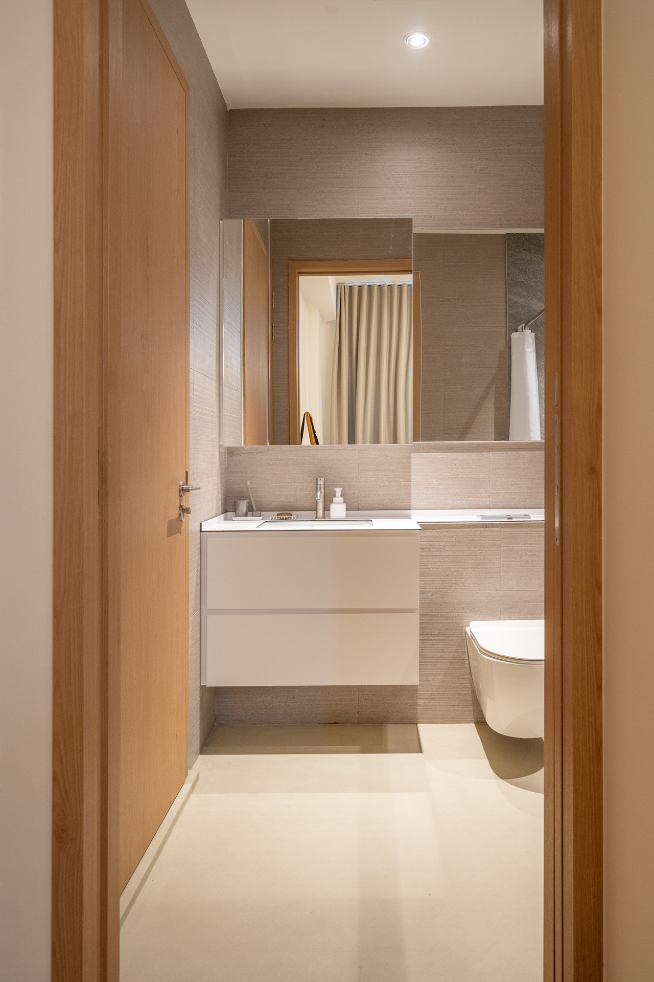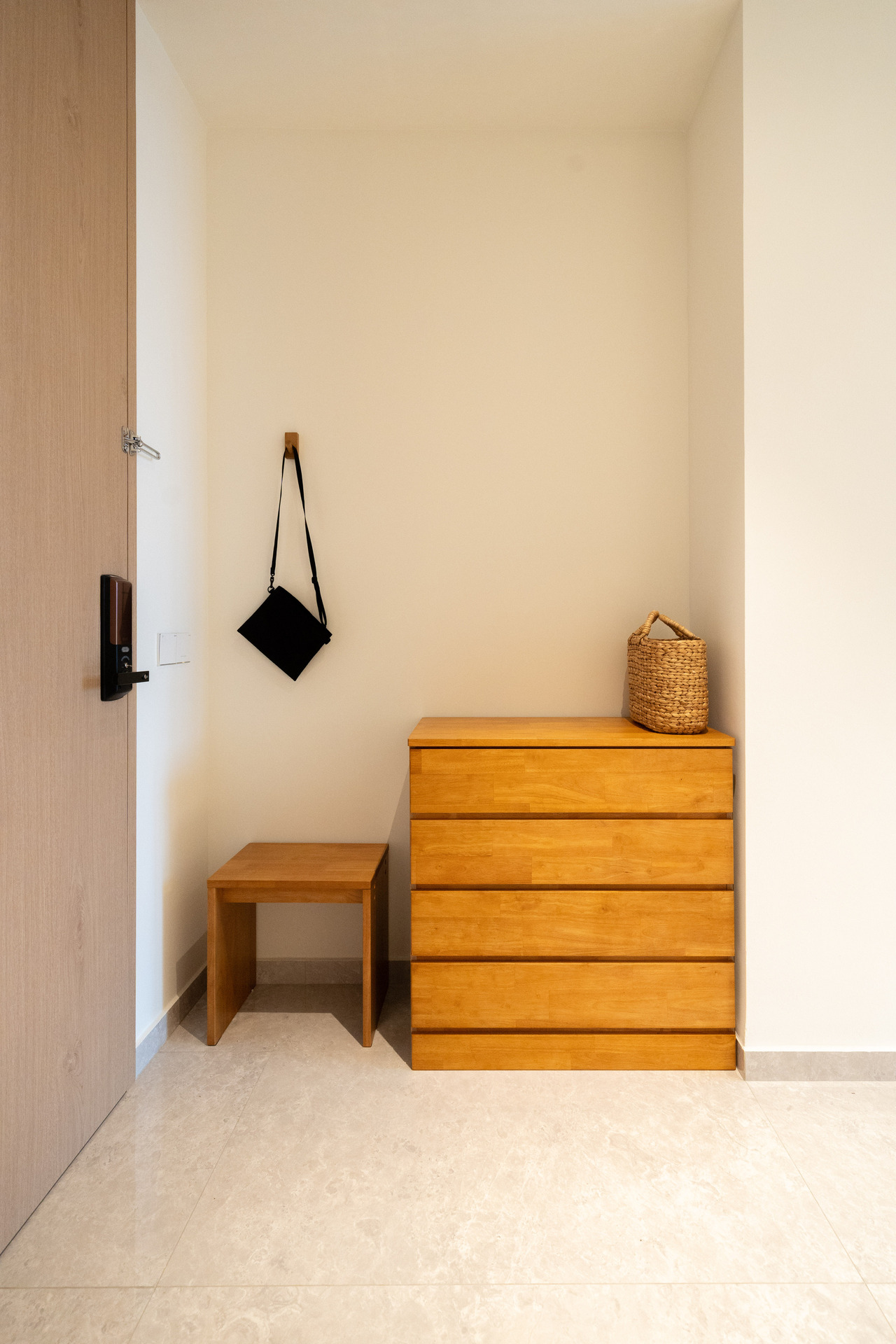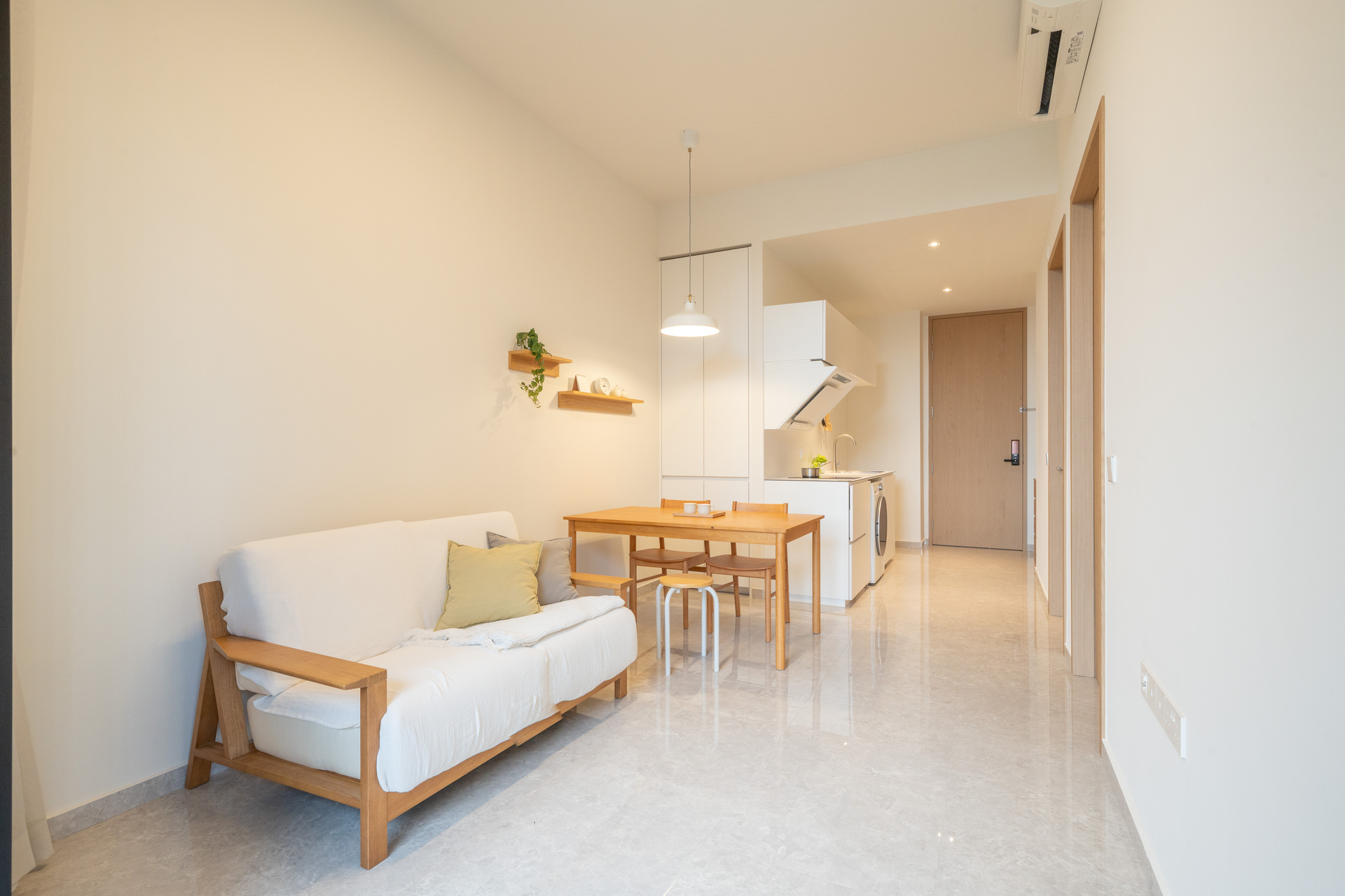 A compact layout elevated through practical design—space-saving furniture and soft, natural tones create a calm, open feel without compromising function.